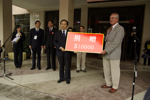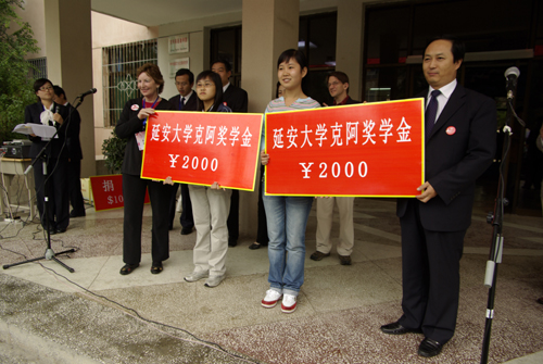 颁奖仪式上,外国语学院院长梁润生宣读了首届“布里几德·克阿奖学金”获奖学生名单。外国语学院2006级英语教育专业4班学生田甜和2007级英语教育专业2班学生景娜获得首届奖学金各2000元人民币,胡副校长和凯瑟琳女士为获奖学生颁了奖。随后,凯瑟琳·海德女士为以其姨奶奶命名的延安大学“布里几德·克阿奖学金”捐赠10000美元。
