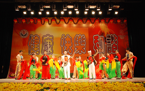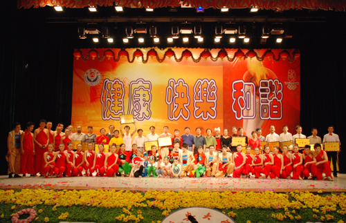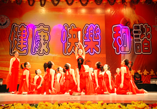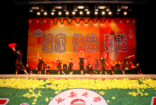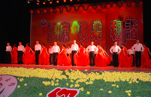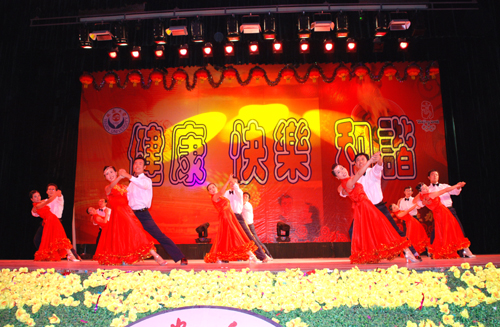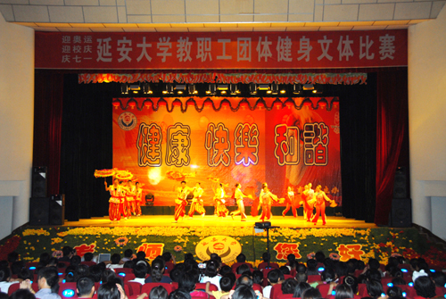 本网讯 6月26日晚,作为“阳光体育”系列活动的一项内容,以“健康、快乐、和谐”为主题的我校教职工团体健身文体比赛在学生大礼堂举行。由各基层工会、分会选送的19个文体节目参加了当晚的比赛。校领导刘建德、高延龙、胡俊生及全校近2000名师生观看了比赛。