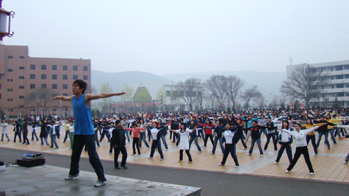 按照阳光体育运动组织领导小组和实施细则的要求,各学院、学生处、团委及学生会纷纷组织学生开展学唱《阳光体育之歌》、普及推广第八套广播体操和24式简化太极拳、举办安塞腰鼓和陕北大秧歌培训班等活动。