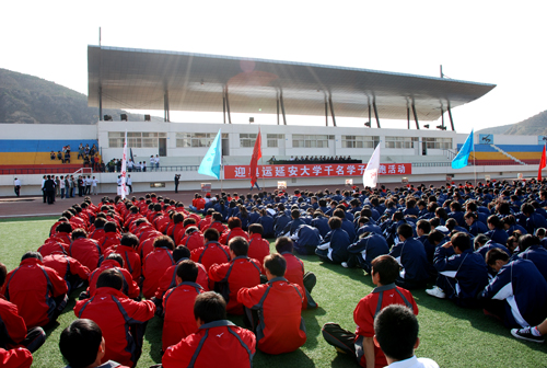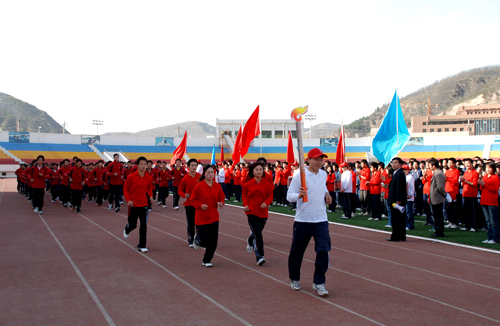 高延龙副书记在讲话中希望同学们以奥运为契机,树立“健康第一”的观念,“走进操场、走进大自然、走到阳光下”,养成自主锻炼习惯,掌握科学锻炼的知识和方法,保持良好的作息规律,自觉坚持长跑,积极投身体育锻炼,形成“人人参与、快乐锻炼、健康成长”的良好态势,以实际行动迎接2008年北京奥运会的到来。政法学院陈浩民作为学生代表发了言。随后,高延龙副书记将“祥云火炬”授予了第一棒火炬手——体育学院的刘文超同学,胡俊生副校长随即宣布迎奥运——延安大学万名学子长跑活动开始。在各学院火炬手的带领下,13个学院的1300名学生以学院为单位,依次绕田径场跑两周。