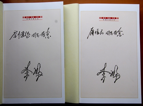 本网讯 4月11日上午,我校党委书记刘建德和校长廉振民同时收到了老校友李鹏同志寄来的书籍《和平 发展 合作——李鹏外事日记》。这是李鹏同志编辑整理的第六部日记体书籍。