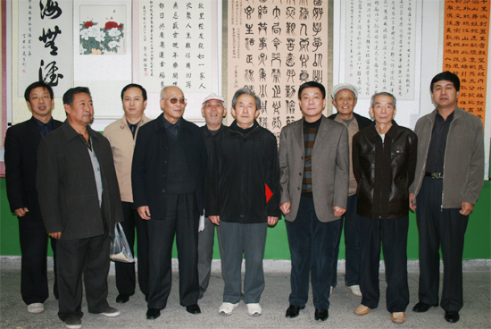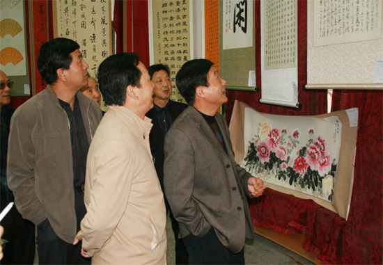 廉振民(右一)、许静洪(左一)、胡俊生(中)等学校领导观看我校老年书画展