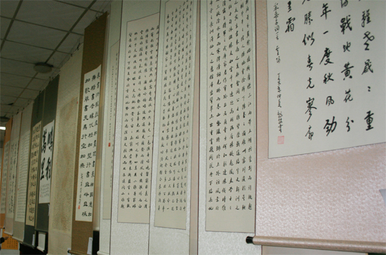 本网讯:2007年10月10日下午,校长廉振民、副校长许静洪、胡俊生在离退处处长郭新年的陪同下,观看我校老年书画展。我校老年书法协会会长、原校工会主席马志昌同志向校领导介绍了本次书画展的情况,老年书法协会任廷祥、王双才、张子刚等书法爱好者与学校领导进行了交流。本次共展出几十幅书画作品,个个都是老年书法爱好者的心灵结晶,反映了我校老年书法又上了一个新的水平。