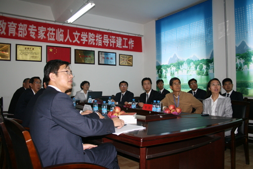 9:00,宋教授对人文社科学院进行了考察指导。院长韩琳教授以PPT形式向专家作了学院评建工作汇报。在随后的交流中,宋教授对学院的工作给予了充分肯定,他指出,学院师生的精神面貌是积极向上、奋发有为的;学院在评估工作中做了大量扎实细致的工作;学院的综合办学实力很强。之后,宋教授又对学院办学质量、学科建设和办学特色等方面提出了建设性的意见。
