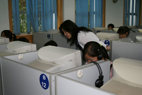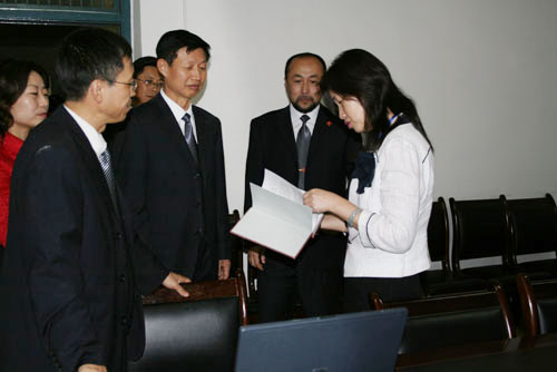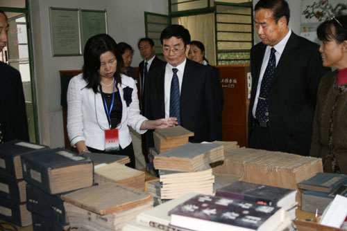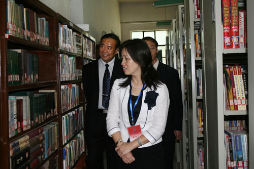 下午5:20,张教授参观考察了我校图书馆历史文献阅览室、革命历史文献室、教师阅览室、电子阅览室等。张教授在考察中对我校特藏的古籍及《红色中华》、《新中华报》、《解放日报》、《新华日报》、《晋察冀日报》等中国共产党早期创办的各种报纸大加赞赏。在电子阅览室,张教授对学生们运用计算机的能力以及利用现代通讯手段获取信息的能力表示十分满意。