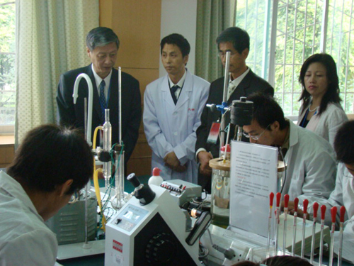 9月24日上午10时30分,教育部评估专家组在省教育厅和校领导的陪同下,对化工学院的公共实验室等设施进行了考察。