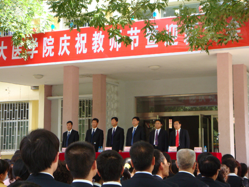 本网讯 9月13日下午,医学院在院行政楼前广场隆重举行庆祝教师节暨迎新大会。校党委副书记、纪检委书记刘庆利,医学院院长苗乃周,副院长惠起源、霍满鹏,院党委副书记马延龙和医学院全体教师、2007级新生及学生代表近600人参加了大会。会议由医学院党委书记路建华主持。