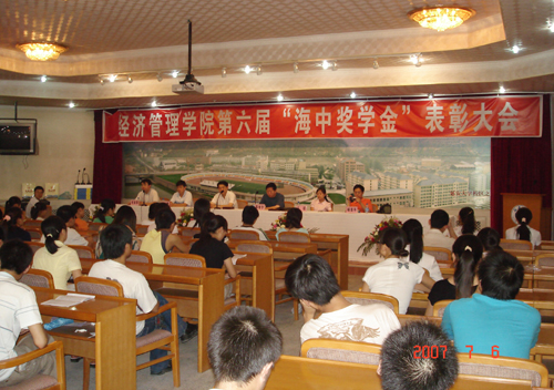 经管学院院长助理任永平宣布了经管学院第六届“海中奖学金”获奖名单,薛维宁经理、乔志杰书记、高峰主任分别向考取研究生的刘海、孙怀禄和学习成绩优秀的方彩燕、赵方方等26位学生颁发了海中奖学金“特别奖”和“单项奖”的荣誉证书和奖金。