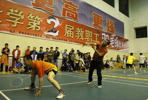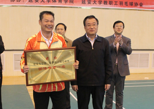 教职工羽毛球协会秘书长、本届比赛裁判长武海明宣布了各项比赛成绩。物电学院代表队、化工学院代表队和附属医院代表队获得本届羽毛球比赛优秀组织奖,团体赛前四名分别由体育学院、外国语学院、附属医院和计算机学院获得。青年男子单打第一名被体育学院代表队的姜晓峰夺得,壮年男子单打第一名被机关三分会的牛延学夺得;女子单打第一名被附属医院代表队的杨丹芬获得,混合双打第一名为陶尚武和蔺永琴;男子双打第一名被拓晓波和唐龙夺得,王辉和刘冉获得了女子双打第一名。崔智林校长、胡俊生副校长及教职工羽毛球协会负责人分别为获奖代表队和运动员颁发了奖牌和证书。