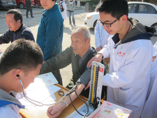 “白衣唱响爱心之歌”爱心医疗志愿服务队 3月22日上午,医学院分团委承办的“白衣唱响爱心之歌”医疗卫生志愿服务队走进延安大学家属区开展义务测体、卫生知识宣传活动。早上8点30分, 由40余名医学生组成的志愿者卫生服务小分队来到延大三大门家属区,为家属区的教职工及其家属进行了义务的测量血压、身高、体重等常规性测体。同时,向退休的老干部、老教师发放老年人科学膳食营养手册,广泛宣传医疗卫生保健常识,倡导大家应该遵循科学的饮食规律,养成良好的生活习惯。活动中,小分队的队员们悉心的搀扶每位年长的老人,精益求精地做到血压测量的准确性,耐心而细致地解答咨询者的每个提问。