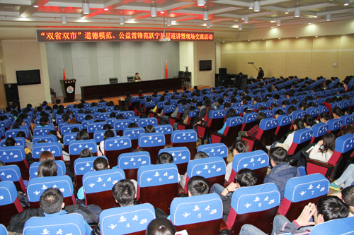 本网讯 3月18日下午,江苏省和陕西省、无锡市和延安市“双省双市”道德模范、全国公益雷锋、无锡市发改委干部范跃宁同志报告会在我校图书馆十楼报告厅举行。我校党委副书记田伏虎,延安市文明办副主任呼延贵出席报告会,我校党委宣传部、学工部、工会、团委的负责人和各学院辅导员、学生代表共400余人聆听了报告。