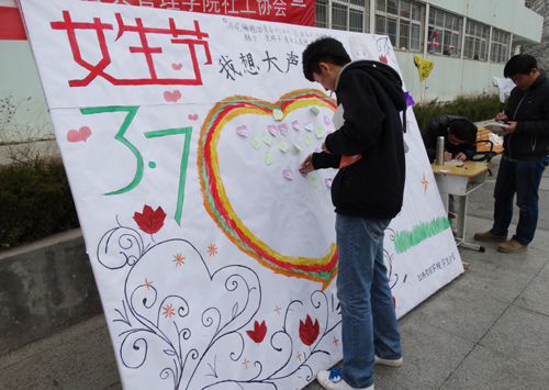 本网讯 3月7日,校团委、校学生会及各学院学生分会共同组织开展了“3·7女生节,你就是主角”活动。活动倡议每个学院为女生挂一条横幅、做一件事情、送一份祝福。学生会“因为你的微笑,延大的上空没有雾霾”及各学院的宣传标语得到了同学们的广泛关注,在微博、微信等平台上被多次转载。部分学院组织男生为女生赠送手工礼品、为女生写贺卡、帮助女生提水,与女生联谊。中午十二点,学生会联合饮食管理科分别在第一餐厅和第三餐厅举办了“幸运百宝箱”女生节抽奖活动,为女生们派送饮料卡、打折卡及免费观影券,并于当天晚上在校活动中心组织了观影活动。