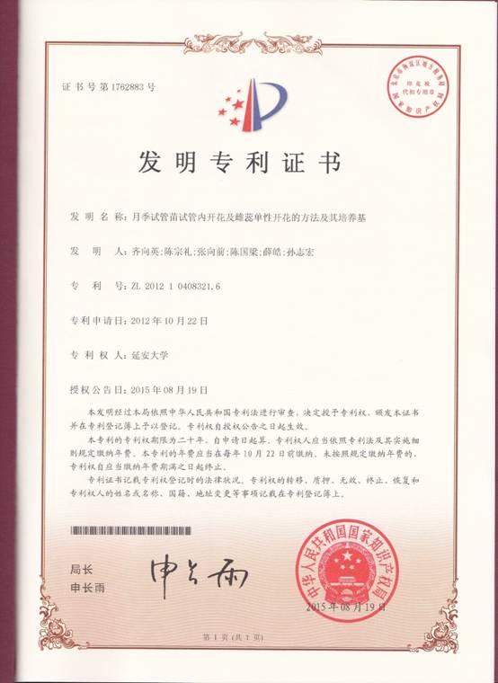 生命科学学院资源植物研发团队齐向英小组从2008年开始,对我国的月季品种“月月红”做了矮化和试管开花研究,在2010年获得月季开花试管苗,2011年获得矮化月季开花试管苗,2012年5月获得月季一株两花试管苗,2012年10月完成雌蕊开花工艺并及时进行了发明专利申报,并于近期获得授权保护。