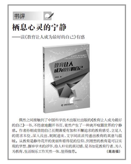 2015年10月27日,《中国企业报》“人文·生活”版刊发中国社会科学杂志社高连福研究员的书评“栖息心灵的宁静——读《教育让人成为最好的自己》有感”,高度评价我校教师孙刚成的专著《教育让人成为最好的自己》。