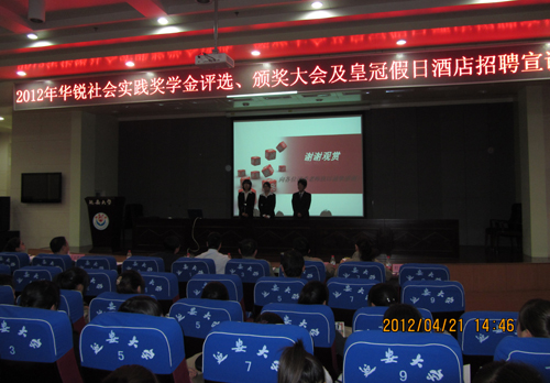 作者:王 进 核稿:姬雄华 编发:新闻中心 发布日期:2012年4月25日 本网讯 4月21日下午,我校管理学院与神木皇冠假日酒店,在图书馆报告厅举办了2012年华锐社会实践奖学金比赛暨颁奖大会,对我校15个参赛队的项目进行了现场评审和比赛。