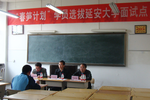 作者:刘 舰 核稿:武忠远 编发:新闻中心 发布日期:2012年5月2日 本网讯 4月27日下午,陕西省“春笋计划”2012至2013年度延安市中学学员选拔面试工作,在我校敷仁楼1101和1102教室举行。