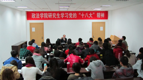 作者:张 元 核稿:张文生 编发:新闻中心 发布日期:2012年11月16日 本网讯 11月15日晚,正值党的十八届一中全会闭幕当天,政法学院邀请中共党史研究院院长高尚斌,给研究生作了题为《坚持中国道路不动摇,为了中国人民更幸福》的十八大辅导报告,60余位政法学院研究生聆听了报告。
