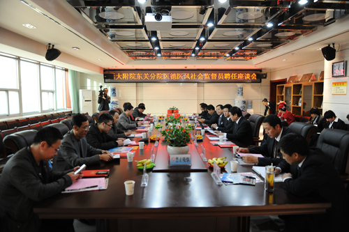 作者:王奋宏 冯延芳 摄影:艾延镇 核稿:李建雄 编发:新闻中心 发布日期:2012年11月19日 本网讯 为了更好地促进行风建设,提高医院信誉度,自觉接受社会监督,日前,附院东关分院在行政楼七楼会议室举行社会监督员座谈会,邀请了宝塔区桥沟乡政府、社区、延安报社、延安电视台等市级相关部门的14名社会监督员进行了座谈。