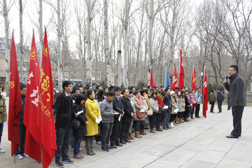 学生记者:王 营 发布日期:2012年11月26日 本网讯 11月25日,由校党委组织部和政法学院党委联合举办的“学习十八大精神,践行党的宗旨,加强支部建设”主题教育活动在延安市枣园革命旧址张思德纪念广场举行。