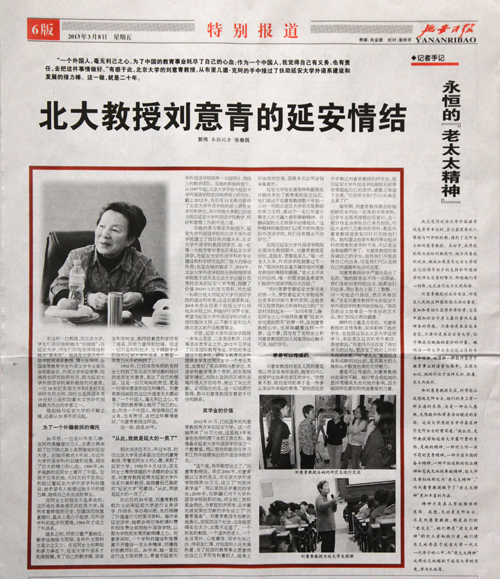 记者:曹兴美 发布日期:2013年3月11日 本网讯 3月8日,《延安日报》在特别报道版,以五分之四版的篇幅,发表了我校新闻中心记者郭伟和《延安日报》记者张春鸽采写的通讯《北大教授刘意青的延安情结》及记者手记《永恒的“老太太”精神》,并配发了相关图片。
